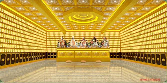 進入財神殿,仿若進入人間仙境,空間的設計使得殿堂有佛光普照之感,讓人感到震撼,既具有藝術性又方便環保。
